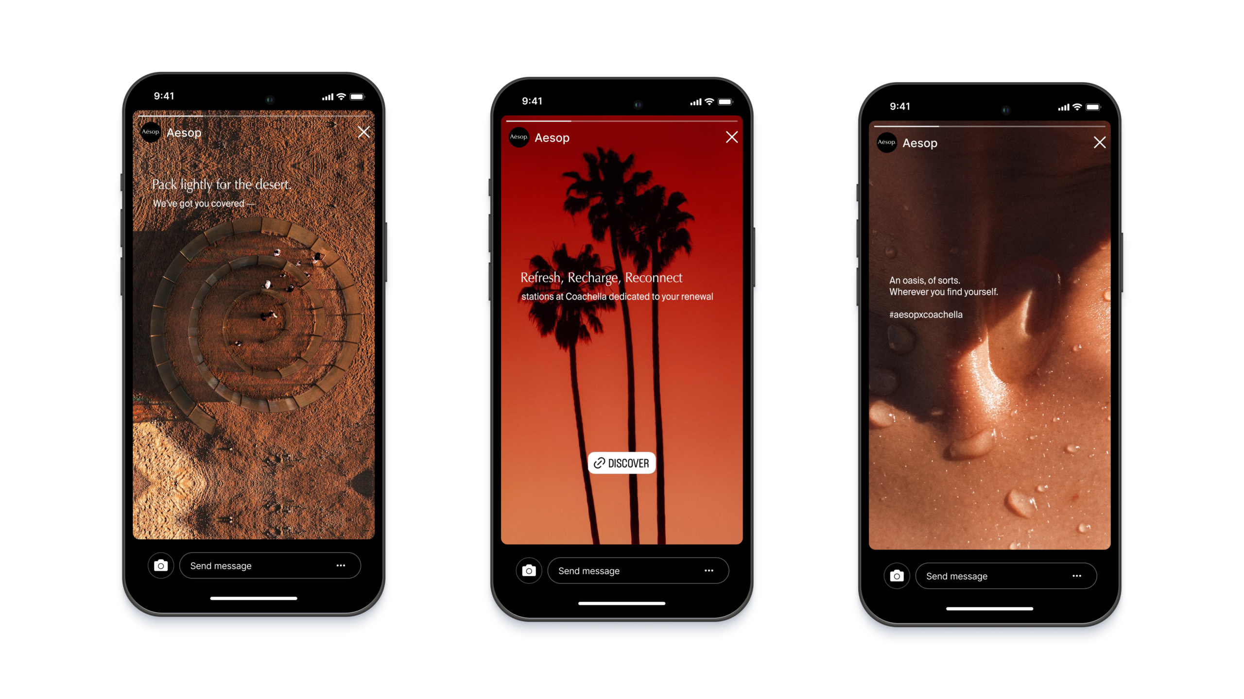 Rather than adapting OOH thinking to social, we teased the Coachella oasis on Stories: not an ad, but an invitation. Quiet, opt-in, unmistakably Aesop.
